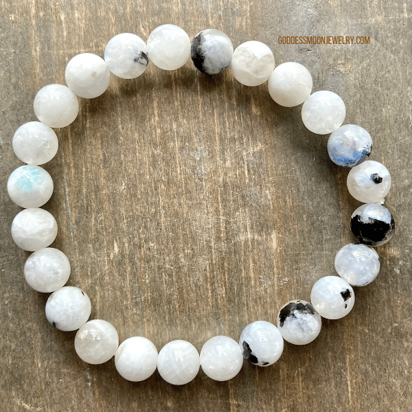 Tap into deep spiritual protection and heightened intuitive energy with this handcrafted Rainbow Moonstone & Black Tourmaline Beaded Bracelet. Featuring luminous rainbow moonstone beads with mesmerizing blue flashes and grounding black tourmaline accents, this piece is as powerful as it is beautiful.