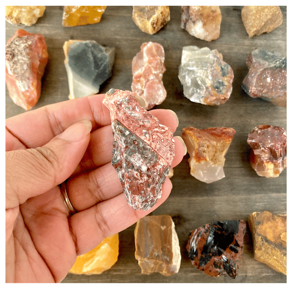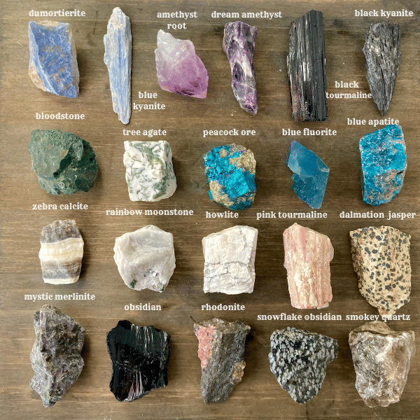 Each stone is Labeled for easy identification, a card with metaphysical descriptions of each stoneโs energy.